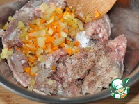 Берём фарш, у меня свиной. Кладём в фарш обжаренные овощи, добавляем по вкусу соль и свежемолотую смесь перцев, перемешиваем. |