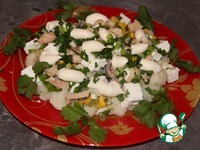 Фету нарезать кубиками. Выложить на капусту фету и кукурузу без жидкости. |