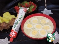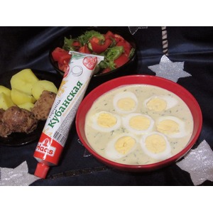 Зелень мелко нарезать. Добавить в соус зелень и нарезанное кубиками яйцо, хорошо перемешать. По вкусу добавить соль, перец и сахар, хорошо перемешать. Выдержать некоторое время в холодильнике. |