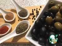 Помидоры, маслины и оливки порезать мелким кубиком, порубить зелень (у меня замороженный укроп). Идеально подойдет базилик сушеный. |