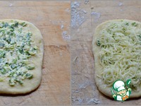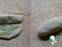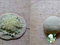 Каждую заготовку раскатать в овал толщиной 0,5 см. Смазать небольшим количеством масла с луком (0,5 ч. л.) Сверху равномерно присыпать чайной ложкой сыра. |