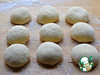 Подошедшее тесто выложить на рабочую поверхность, присыпанную мукой, обмять, разделить на 9 равных частей (округлить заготовки) |