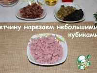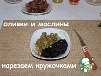 Добавляем оливки, маслины и ветчину. Хорошо перемешиваем. |