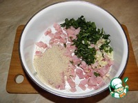 Мелко кубиками режем ветчину, мелко рубим чеснок, петрушку, добавляем хлебную крошку |