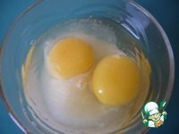 Разбить в миску два яйца. Добавить в яйца сахар, щепотку соли и взбить венчиком. |