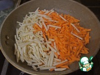Корень петрушки и морковь очистить, вымыть и нарезать соломкой. Слегка спассеровать их на растительном масле. |