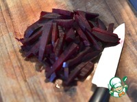 Свеклу почистить и нарезать соломкой. Добавить к остывшему картофелю. |