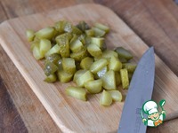 Маринованные огурцы нарезать на кусочки. Добавить к салату. |