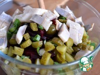 Нарезать на кусочки филе селедки. Добавить к салату. |