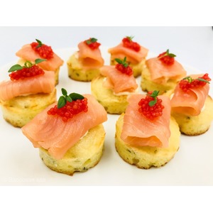 Далее выложить на каждую мини-булочку немного сливочного хрена, ломтик красной рыбы, икру и зелень. Готово!
