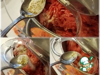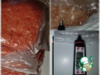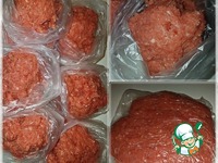Дальше мы разложили фарш по порциям граммов по 400. Смысл такой развесовки я потом объясню. Порции сплющили в блины толщиной примерно сантиметр. |