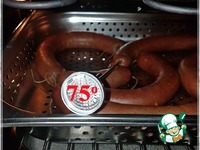 Когда температура внутри колбасы достигнет семидесяти пяти градусов (минимум – семьдесят, максимум - … не стоит превышать восьмидесяти, и то много будет)… |