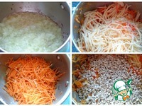 В кастрюлю налить растительное масло и обжарить лук до прозрачности, добавить морковь - жарить три минуты, добавить брюкву - пожарить еще три минуты, затем добавить разбухшую перловую крупу. |