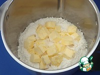 Холодное масло нарезать кубиками, добавить к мучной смеси. |