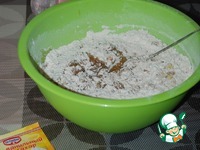 В отдельной посуде смешать просеянную муку, специи, соду, добавить измельчённые орехи. |