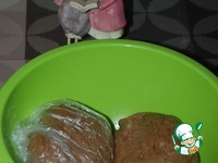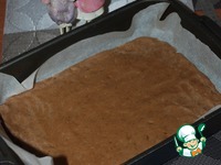 Оно получится жидковатым. Ставим тесто в холод на 30 минут. За это время тесто немного затвердеет. Можно поделить на две части и выпечь два коржа. |
