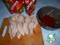 Крылья кладем в маринад, перемешиваем, накрываем пищевой пленкой и оставляем мариноваться часа на два. |