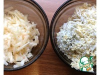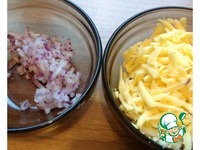 Сыр натереть на крупной терке, лук нарезать очень мелкими кубиками. |