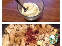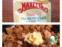 Чеснок пропустить через пресс, добавить к мясу. Так же всыпать специи, перемешать. В чашке смешать муку с майонезом. |