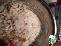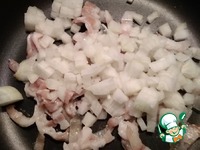 Лук порезать кубиками и обжарить с нарезанным беконом (если бекон сырой, то посолить) |