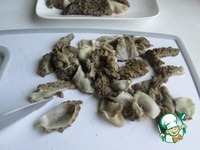 Разрезать грибы пополам, ( видно, что они полые внутри) и затем на кусочки. Ножки лучше сразу отрезать, потому что сколько ни вари, они так и останутся жёсткими! |