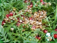Описание: Салат с рукколой, гранатом и голубым сыром. Прекрасный лакто-вегетаринский салат. Пряный, ароматный и довольно сытный, благодаря руколе и голубому сыру.