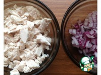 Куриное филе нарезать маленьким кубиком, как и лук. |