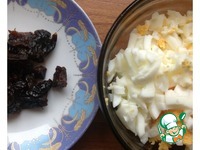 Яйца нарезать небольшим кубиком, как и чернослив. Предварительно его замачивать не надо. |