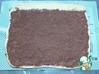Тесто раскатать в пласт примерно 40*50 см. Мягким сливочным маслом смазать поверхность теста, оставляя свободным край теста, примерно 1,5 –2 см. Посыпать сахаром. И натертым шоколадом. |