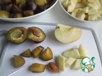 Пока варится сироп из слив удалить косточки. Если слива крупная, то нарезать на кусочки. Яблоки очистить, удалить сердцевину и нарезать дольки. |
