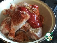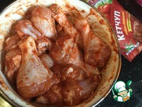Крылья разрежьте по суставу. Положите в миску крылышки и голени, добавьте специи и кетчуп МахеевЪ Шашлычный, посолите. |