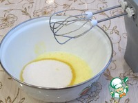 Желтки взбить с оставшейся частью сахара до бела, затем добавить крахмал (60 гр.), добавить разрыхлитель (1/2 ч. ложки). Смесь еще раз взбить. |