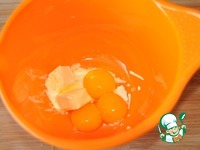 В третью миску кладём желтки и подтаявшее сливочное масло. |