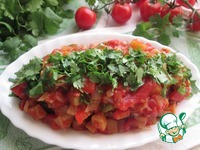 Третий слой баклажана накрыть овощами и украсить по центру измельчённой кинзой. |