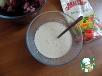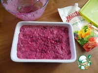 Натираем на средней тёрке свёклу и картофель. Помещаем в салатник, где удобно будет перемешивать продукты. Выкладываем в другую посуду майонез. Готовим желатин. |