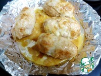 Выложить куриные рулеты краем вниз на противень сбрызнутый растительным маслом. Отправить в разогретую духовку на 40 минут при температуре 180 градусов. |