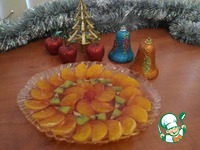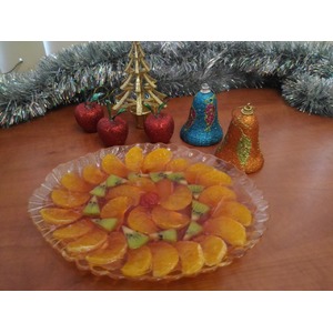 Киви нарезать ломтиками и обдать кипятком, иначе желе не застынет. Выложить на блюдо в форме ёлочки. Игрушки -замороженные ягоды малины. |
