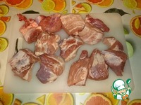 Режем мясо на порционные куски. Пару головок лука нарезаем полукольцами. |
