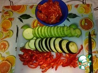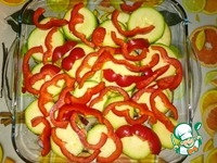 Баклажан, кабачок, лук и помидоры нарезаем кольцами. Чищеный болгарский перец - полукольцами. Особо мельчить не нужно. |