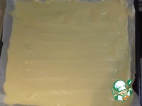 Все опять перемешиваем. На противень, застеленный пергаментной бумагой, выкладываем тесто толщиной 0,5 см. |
