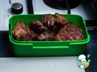 Рецепт имеет некоторое своеобразие: сильный уклон в низкую калорийность при максимальном сохранении вкуса традиционного рецепта. Потому мясо постное, жарится без масла, и в конце тоже не поливается маслом со специями, тем не менее гарантирую: получается просто прекрасно. Да, и текста будет много, но сократить никак не возможно. Сокращение рецепта на любую строчку - риск, что у кого-то мясо выйдет не очень хорошим.