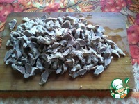 Добавляем порезанные желудочки к овощам. Добавляем красный острый перец, его требуется довольно много, но все-таки надо соблюдать осторожность, если будет мало – можно добавить потом, все равно готовое блюдо будет долго настаиваться. Вливаем пару чайных ложек уксуса. Уксус желательно винный (красный или белый), но можно и столовый, 6-процентный. Заливаем соевым соусом так, чтобы он доходил примерно от трети до половины высоты овощей при надавливании, но не покрывал их. Перемешиваем и оставляем мариноваться. Соевый соус надо брать натуральный. От качества соевого соуса во многом зависит результат. Желательно использовать соевый соус естественной ферментации. Используя соус синтетический или невысокого качества вы рискуете «не получить результат». Я использую Сен-Сой. Наверно, можно взять «Кикоман», но он заметно ниже качеством. Используя такие, как «Хайнц», «Стебель бамбука» и подобные вы рискуете получить малосъедобное блюдо.