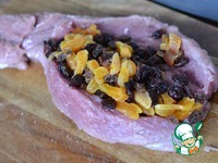 Выкладываем рулет на противень или миску для запекания. Залить вином. Добавить оставшиеся фрукты. Запекать 25 минут при 180гр. Потом прикрыть фольгой и допекать до готовности. |