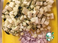 Сначала подготовим овощную смесь. Мелко нарезаем 1 луковицу, баклажан и грибы мелкими квадратиками 1на 1 см. Помидоры - желательно снять шкурку (ошпарить их и очистить) тоже очень мелко нарезать. |