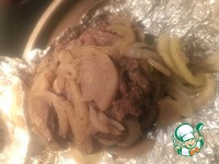 3 средние луковицы нарезаем полукольцами. Берем большой лист фольги и ровным слоем (размером как стейк выкладываем нарезанный лук). Как следует перчим лук. |