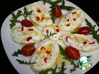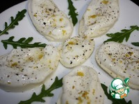 Моцареллу нарезать на пластинки. Намазать каждую сметаной, посолить, поперчить. С лимона снять цедру и тоже посыпать на сыр. С половины лимона выдавить сок и полить им аккуратно каждую пластинку. |
