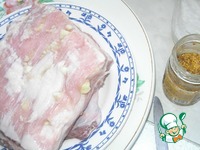 После того как мясо со всех сторон занято яблоком и чесноком, можно посолить, нанести и хорошо втереть зернистую горчицу. |