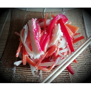 Описание: Угощалась в ресторанчике, именующем себя "китайской кухней" этим салатиком, очень понравился вкус - совершенно не острый (хотя я любитель острых корейских вариантов), легкий, сочный, кисло-сладкий, собирала потом дома по памяти ощущений, в оригинале он был с кальмаром, но как-то один раз сделала с крабовыми палочками из экономии времени и прижилось))) Это один из нескольких салатов с болгарским перцем, который ест моя дочь, потому зимой делаю достаточно часто как витаминную профилактику, иногда из замороженного своего перца, который сразу нарезан под этот салат.