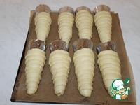 Конус смазываем растительным маслом. Полоску теста накручиваем по спирали. |