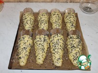 Смазываем желтком с 1 ст л молока и посыпаем кунжутом. Выпекаем при температуре 200 градусов 15-20 минут. |